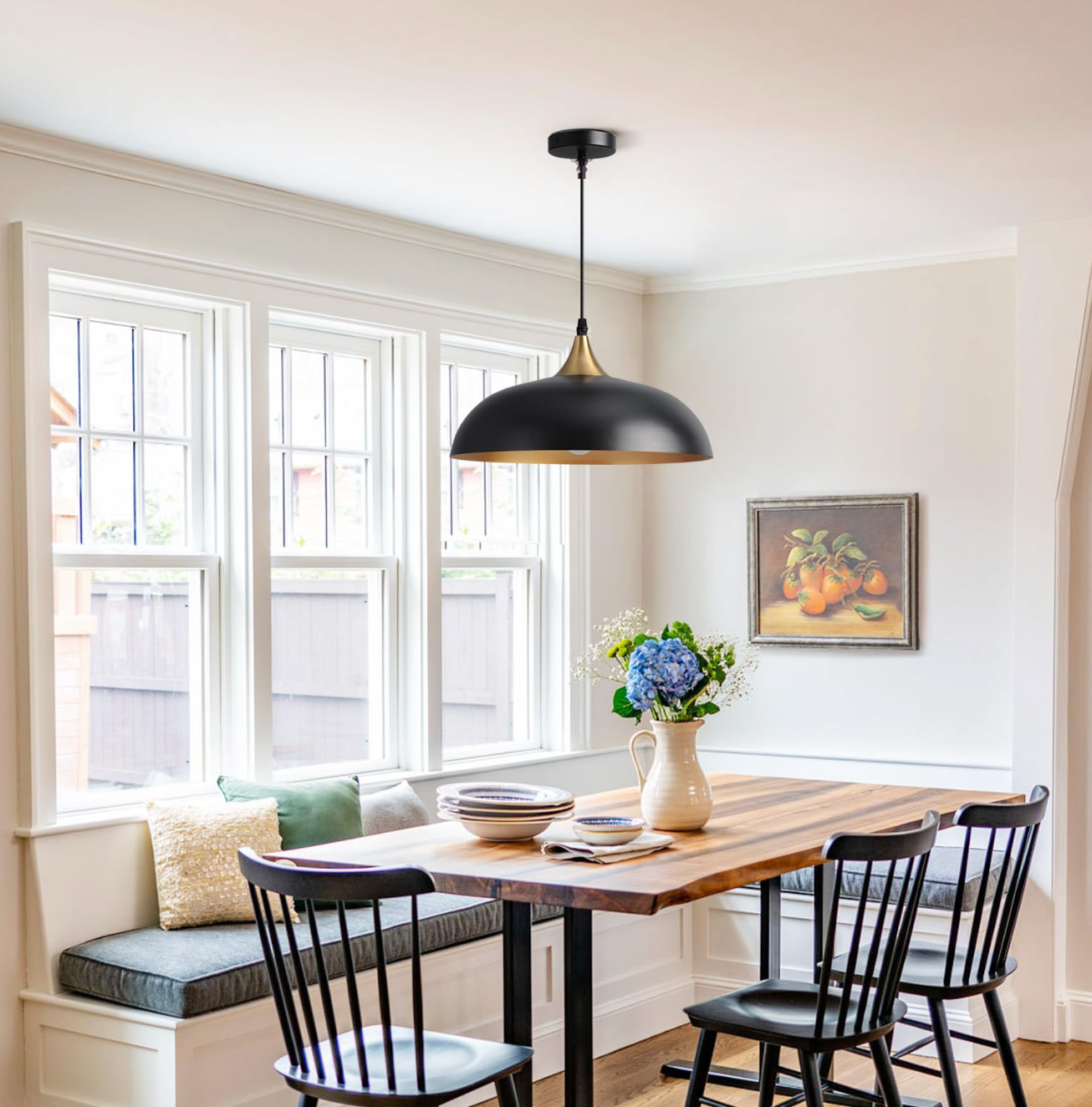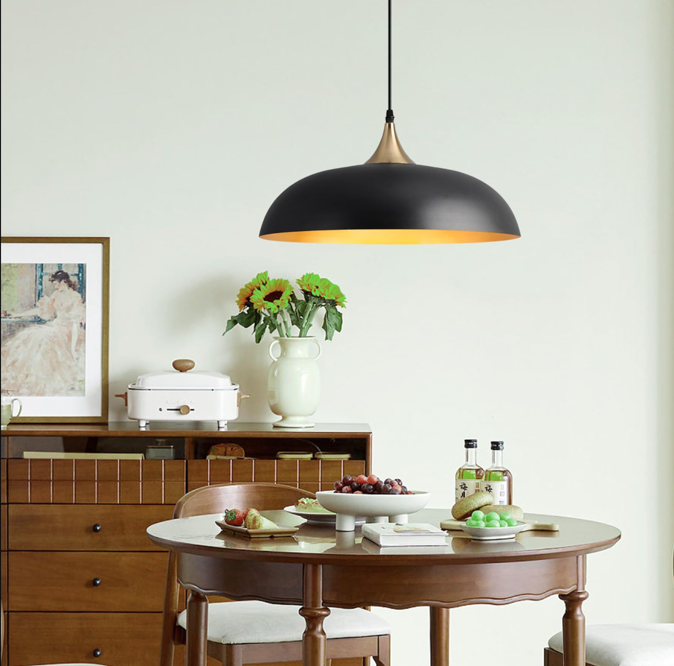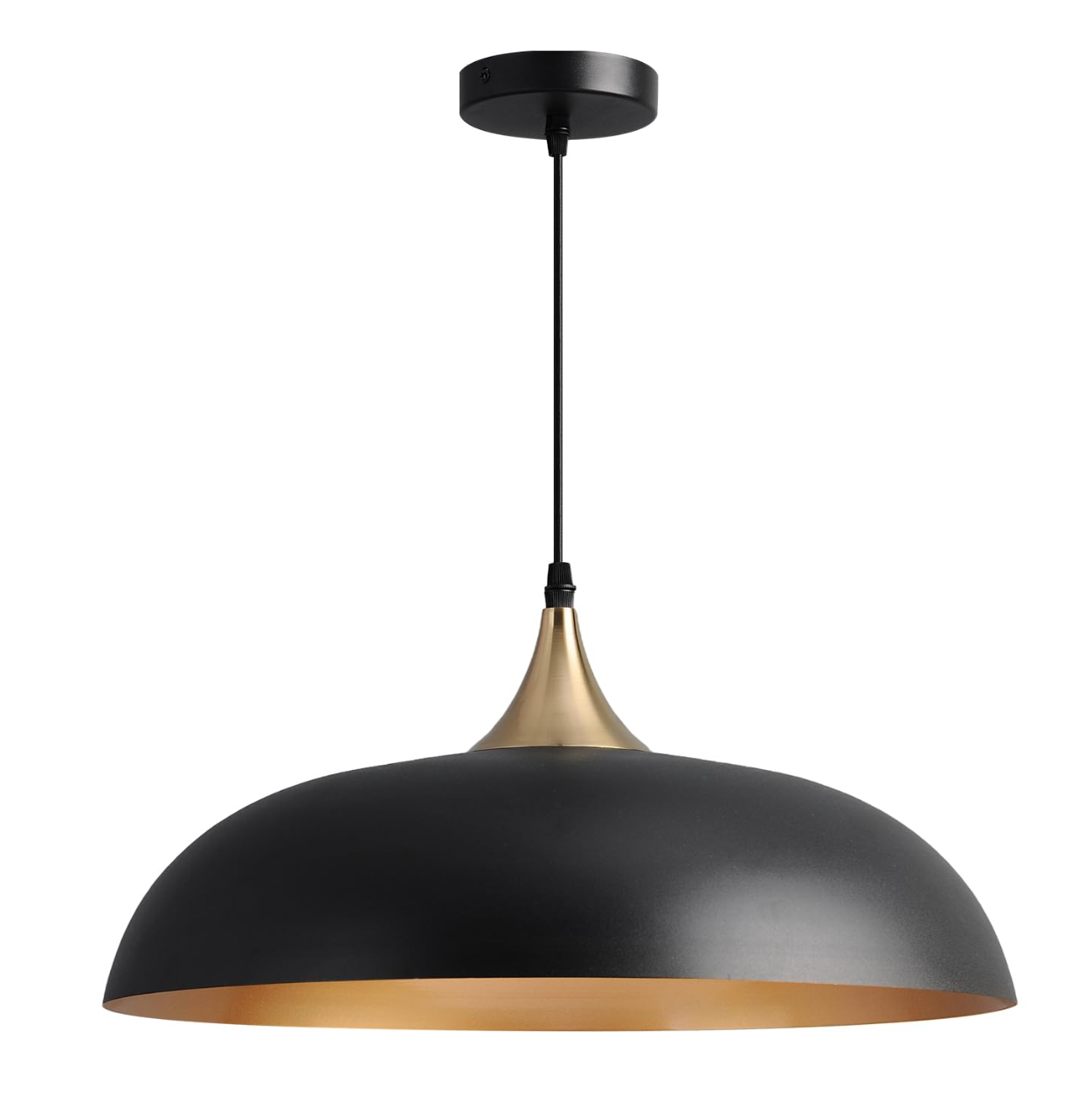 This large pendant lamp features a dome shade and is crafted from sturdy metal with a beautiful black paint finish and copper tone interior for a vintage farmhouse look.