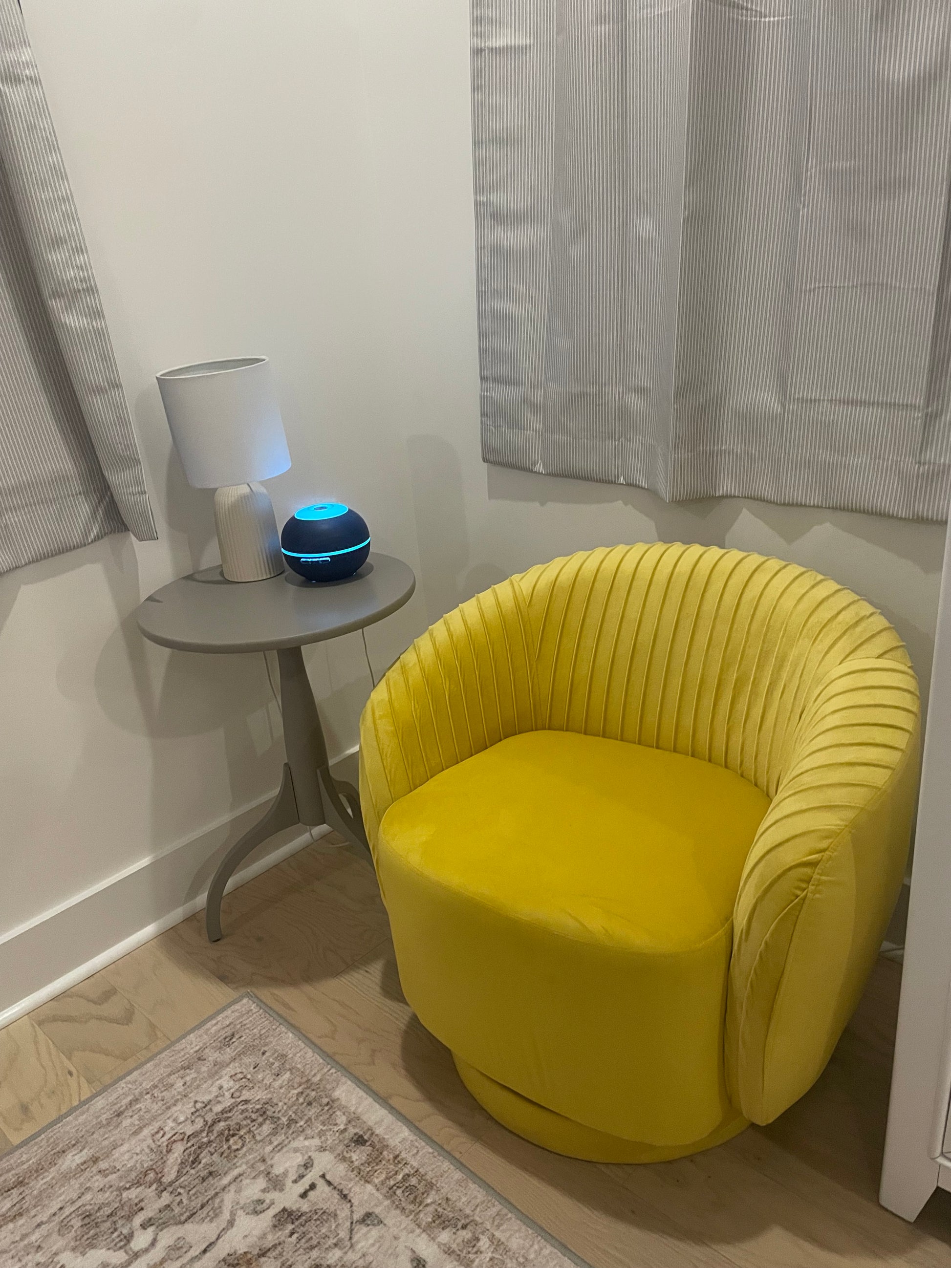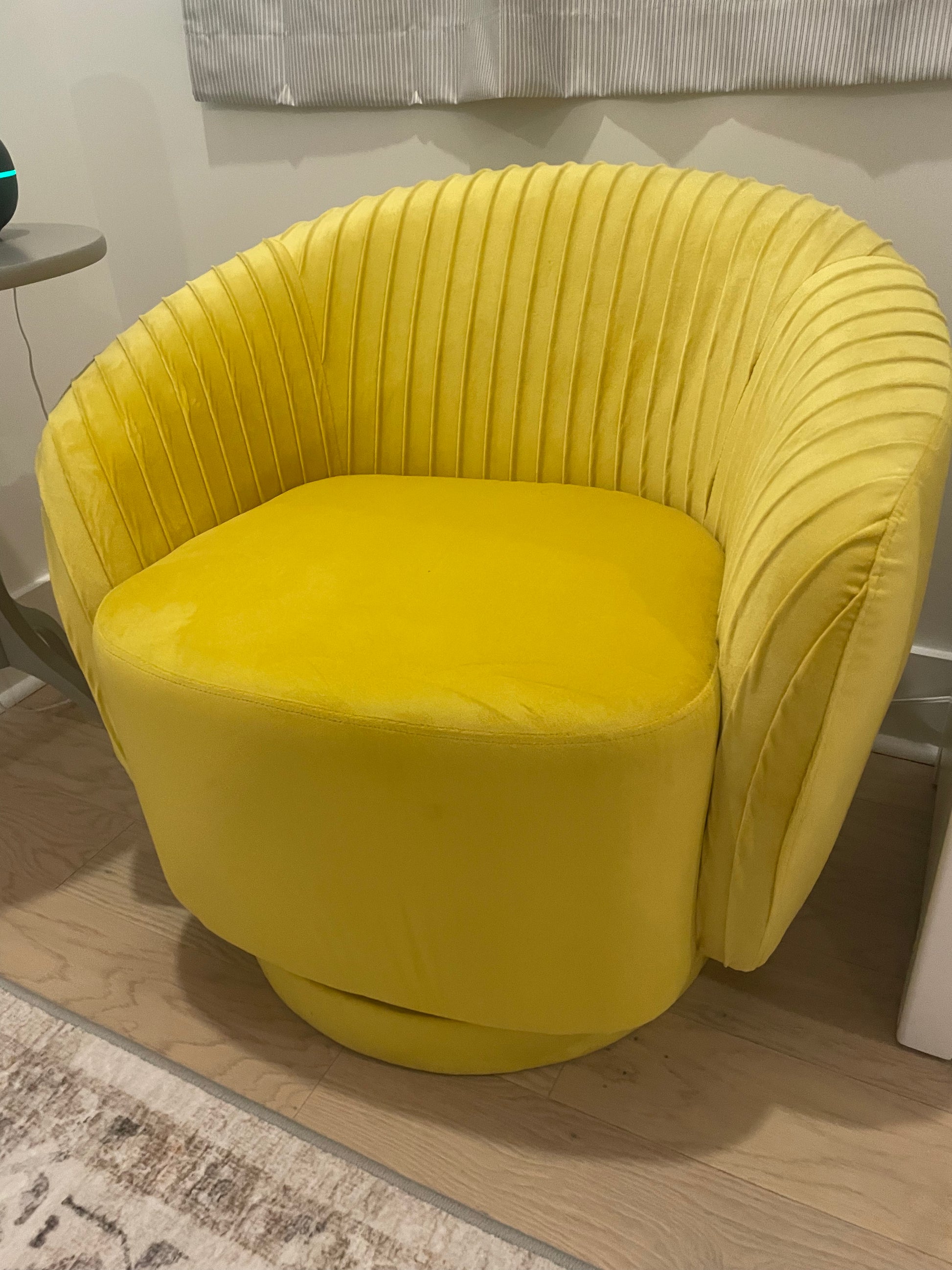 Take a seat and swivel in style with this Small Yellow Velvet Swivel Barrel Armchair. Dressed in a warm, sun-kissed yellow, it's a delightful splash of color that can brighten up any space. The plush velvet upholstery gives it an irresistibly soft touch while the barrel design adds a contemporary twist. Not just all about looks, this armchair is also big on comfort with its generous padding and 360-degree swivel function. It's compact size makes it an ideal fit for small apartments or cozy corners. A stylish little chair that packs a lot of punch!
